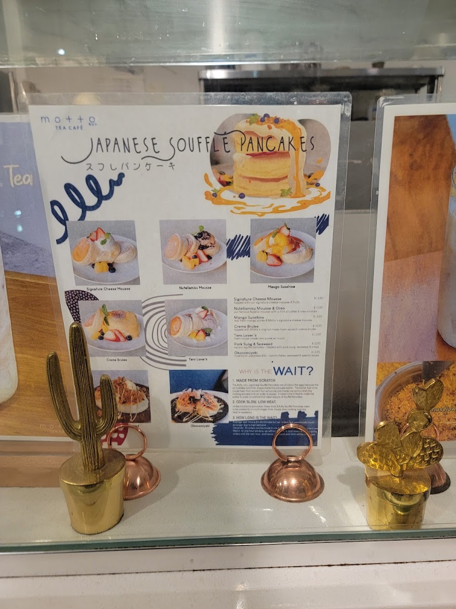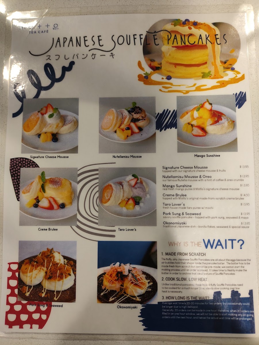 Pancakes and Desserts: The dessert offerings primarily include soufflé pancakes such as Mango Sunshine Soufflé Pancake and Crème Brûlée Soufflé Pancakes. These items are made fresh and generally require additional preparation time.