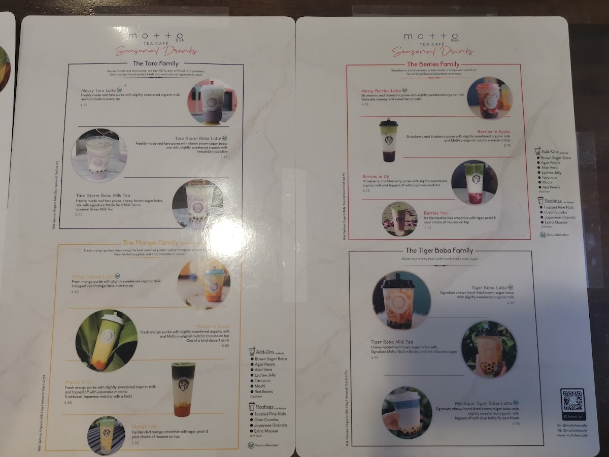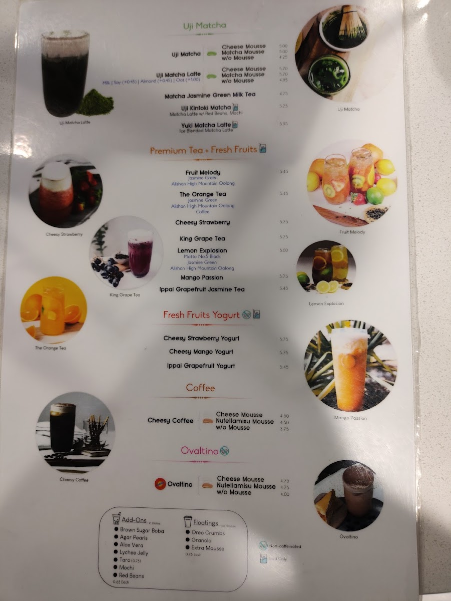 Bubble Tea and Milk Tea: The menu includes the Tiger Boba Family with options like Tiger Boba Milk Tea made with hand-fried brown sugar and customizable milk tea bases. There is also a NonCaffeinated Tiger Boba Latte, catering to a range of preferences.